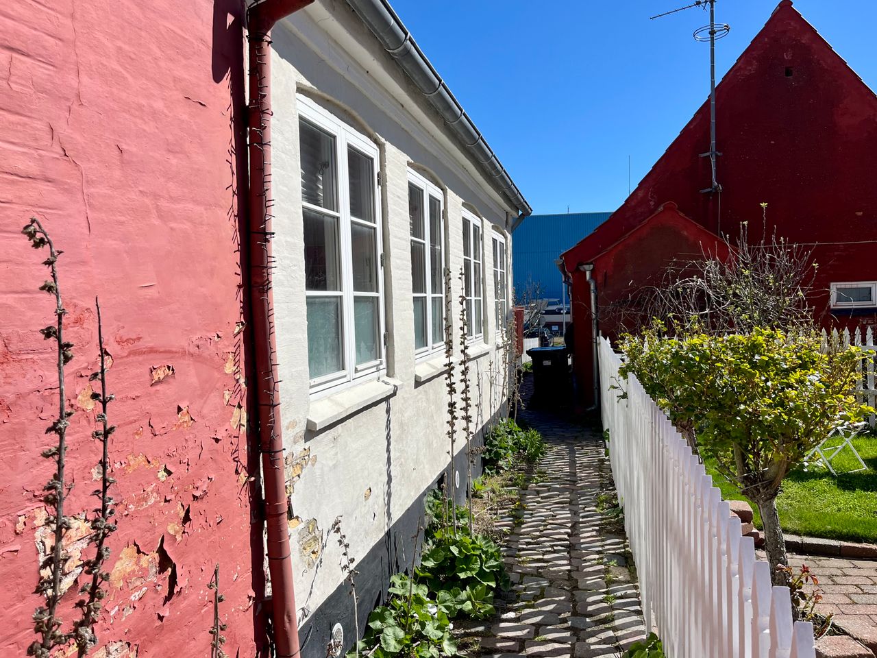 Færgestræde er en af de mest idylliske og ældste gader i Marstal. Her svajer stokroserne langs fortovet, mens duften af roser lifligt fylder luften.