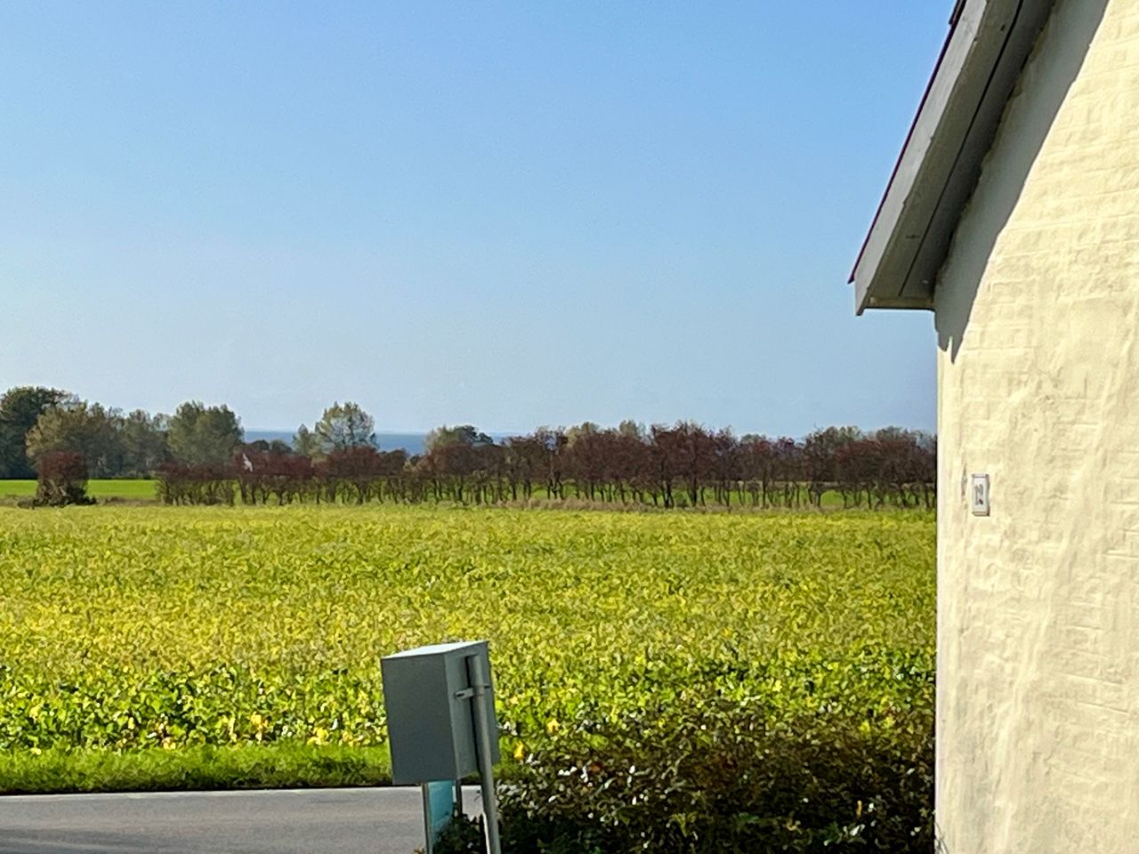 Fra 1. sal er der udgang til træterrasse, lavet 2024, hvor man her også kan nyde udsigten over de åbne marker - og Østersøen kan ses i horisonten.