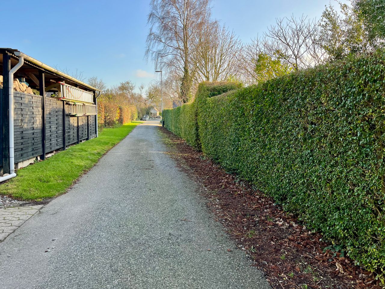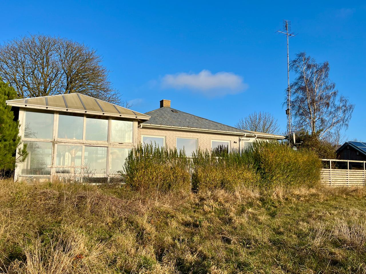 Der en hyggelig have med træer og et stort udhus/brændeskur, carport, samt stor udestue med god udsyn til naturen.
