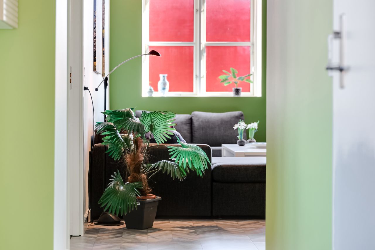 Indgang fra gårdhaven, hvor du træder ind i en stor entré / gang til husets rum - og hvor køkken er i åben forbindelse med gangarealet. Der er 2 gode soveværelser, flot badeværelse og lækker stue. Der er højt til loft, flotte store vinduer og gulvvarme i alle gulve.